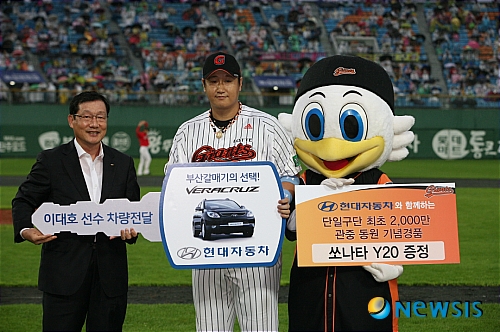 롯데 자이언츠와 SK 와이번스 간 경기가 열린 이날 사직구장에서 현대차는 6회초 시작 전 클리닝 타임에 이대호 선수에게 베라크루즈 차량을 전달하고 홍보대사로 위촉하는 행사를 가졌다.