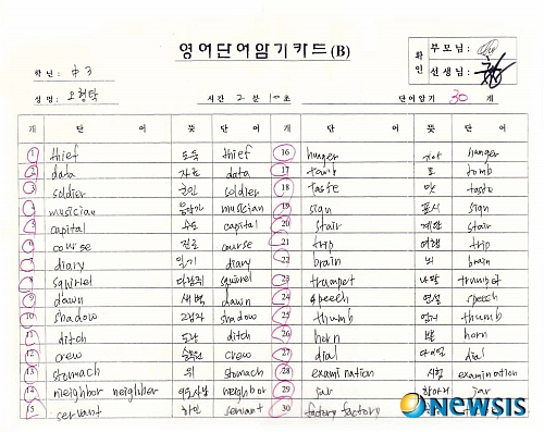 암기카드B는 30개의 영어단어를 1+2원칙으로 적고 뜻을 적는다. 그리고 다시 뜻만 보면서 단어의 철자를 적어본다. 단어와 뜻, 그리고 다시 뜻을 적었다면 채점을 해서 결과를 기록한다. 항상 채점하기 전의 상황까지 시간을 측정하여 집중력과 스피드를 강화하도록 한다.