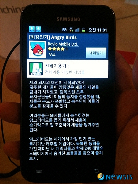 19MB 용량인 앵그리버드를 다운로드 받는데 걸린 시간은 22초. 행사장에 진열된 다른 갤럭시S2 단말기를 사용해봐도 속도는 크게 향상되지 않았다.