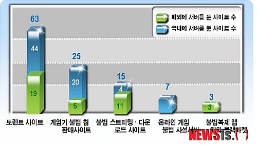 적발된 113개 중 토렌트 사이트가 63개로 가장 많았다. 이어 게임기의 저작권 보호기술을 무력화시키는 칩(R4·DSTT)을 판매하는 사이트 25개, 영화·음악 스트리밍·다운로드 사이트 15개, 온라인게임 불법 사설 서버 7개 등으로 집계됐다.