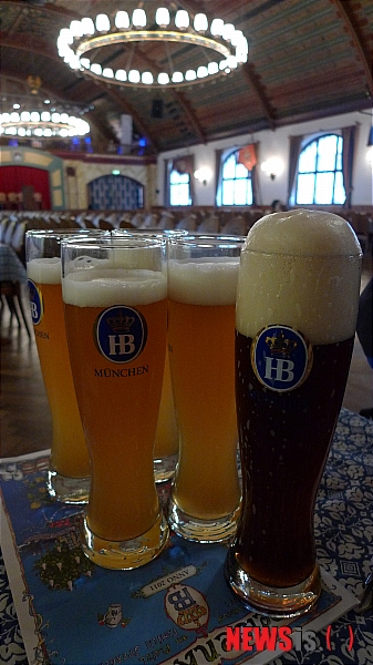일행과 1층(독일 등 유럽은 우리가 1층이라고 부르는 곳은 땅층·L층, 2층이 1층, 3층은 2층으로 부른다)으로 올라가 자리에 앉아 맥주를 시켰다. 뮌헨에서 13세기부터 전승돼오는 ‘라거 비어’와 ‘둥클래스 바이스 비어’(흑맥주)를 골랐다. 안주는 이 집의 명물인 ‘바이스 보르스트’(하얀 소시지)와 독일의 별미 ‘슈바인스 학세‘를 주문했다.
