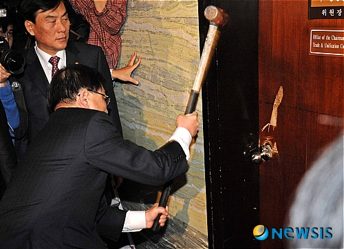 당시 한나라당 의원들이 외통위 회의실로 입장한 뒤 문을 걸어 잠그자 민주·민노당 국회의원과 보좌진 등 당직자 150여명은 해머를 동원해 문을 부쉈다.