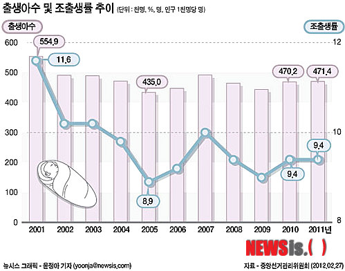 통계청이 27일 발표한 '2011년 출생·사망통계(잠정)'에 따르면, 지난해 출생아수는 47만1400명으로 전년에 비해 1200명 증가했다.