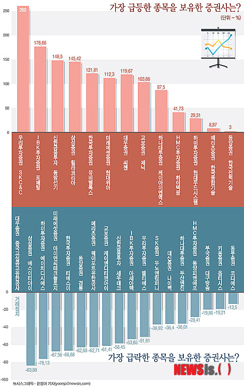 뒤이어 ▲하이투자증권 '에이치디시에스'(-76.13) ▲미래에셋증권 '아이앤씨테크놀로지'(-67.56) ▲한국투자증권 '티에스이'(-66.88) ▲우리투자증권 '엘티에스'(-51.61) ▲동양증권 '경봉'(-62.88) ▲메리츠증권 '웨이포트유한공사'(-62.71) ▲교보증권 '케이엔디티앤아이'(-61.41) ▲신한금융투자 '세우테크'(-58.45) ▲IBK투자증권 '아세아텍'(-53.65%) 등의 순이었다.