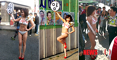 낸시랭은 4·11총선을 이틀 앞둔 지난 9일 흰색 비키니를 입고 빨간색 하이힐을 신은 채 여의도 국회의사당을 비롯해 사람들이 많이 모이는 홍대와 광화문 일대에서 투표 참여를 독려하는 퍼포먼스를 펼쳤다.