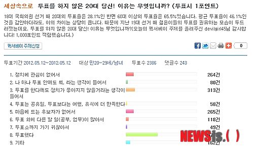 15일 온라인리서치 리서치패널코리아에 따르면 지난 12일 20대 2386명을 대상으로 설문조사한 결과 투표를 하지 않은 1309명 중 24%(313명)가 '투표를 한다 해도 정치가 좋아지지 않을 거라는 생각이 들어서'를 택했다.