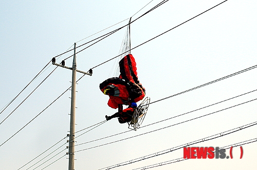 【서천=뉴시스】권교용 기자 = 20일 오후 12시 14분께 충남 서천군 마서면 도사리 금강변 인근에 위치한 고압선에 주말 레포츠를 즐기던 강 모(47·광주시)씨 패러글라이딩이 걸리는 사고가 발생했다.