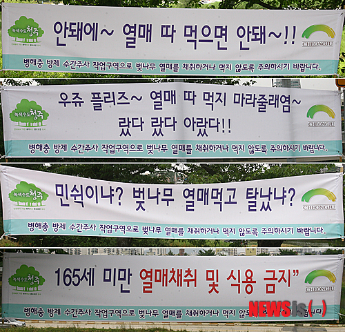 무심천변 벚나무 병충해를 막기 위해 수간주사사업을 벌이고 있는 시는 벚나무 열매를 채취하거나 따먹지 말 것을 시민들에게 당부하는 내용의 현수막 30장을 걸었다.