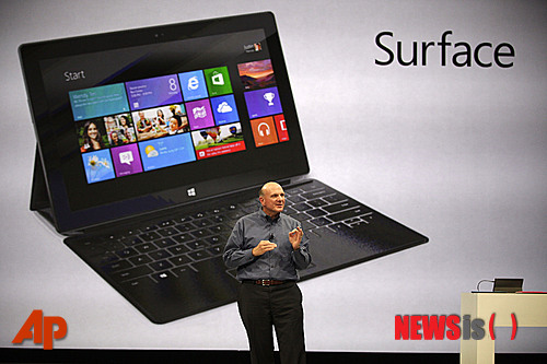 【로스앤젤레스=AP/뉴시스】유세진 기자 = 마이크로소프트(MS)가 18일 애플의 아이패드와 경쟁하기 위해 자체 개발한 태블릿 컴퓨터 '서피스'(Surface)를 공개했다.