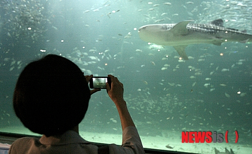 관람객들의 눈 앞에 믿을 수 없는 광경이 펼쳐지고 있다. 그 동안 생물도감에서만 볼 수 있었던 거대한 고래상어가 바로 코 앞에서 유유히 헤엄을 친다. 그것도 한 마리가 아닌 두 마리다. 이들 4~4.5m의 회색 거대 생물은 가히 바다의 왕자라 부를만 했다.