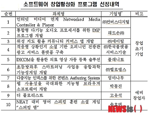 지경부 관계자는 SW공모전 입상자 또는 창업 초기기업이 보유한 창업 아이템 사업화를 목적으로 ‘소프트웨어 창업활성화 프로그램’을 추진해 최종 과제를 선정했다고 밝혔다.