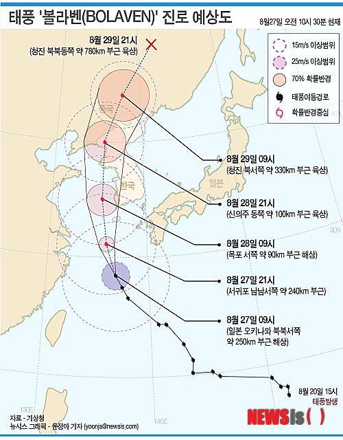 【서울=뉴시스】배민욱 기자 = 초대형 태풍 '볼라벤(BOLAVEN)'은 28일 오후 2시께 서울에 가장 근접한 위치에서 우리나라에 영향을 미칠 것으로 보인다.
