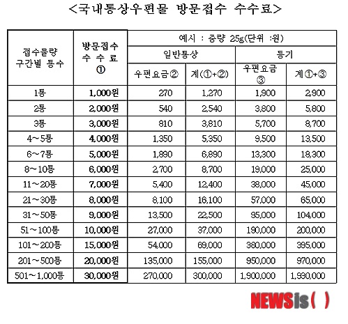 예를 들어 중량 25g짜리 등기 1통을 방문 접수시킬 경우 방문접수 수수료 1000원에 우편요금 1900원을 합쳐 2900원을 내면 된다.
