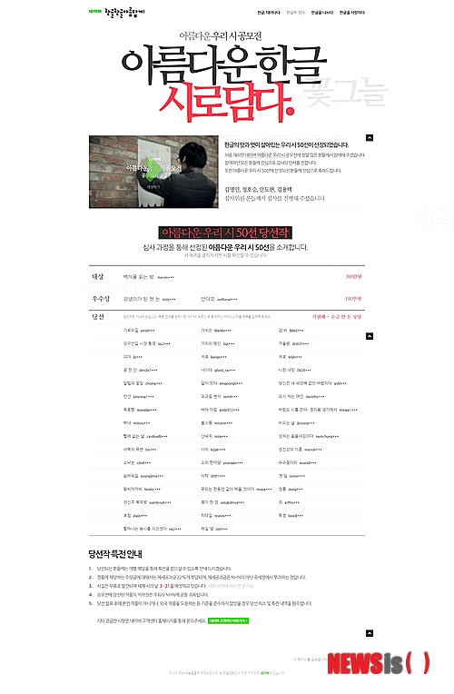 【서울=뉴시스】백영미 기자 = 네이버 운영업체 NHN은 지난해 한글날을 기념해 개최한 '아름다운 우리 시(詩) 공모전' 당선작 50편을 발표하고, 당선 작품 50선이 담긴 기념시집을 펴낸다고 11일 밝혔다.