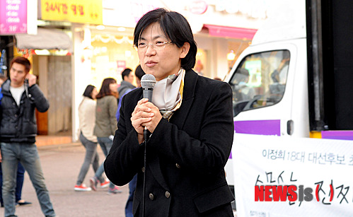 【전주=뉴시스】김운협 기자 = 통합진보당 이정희 대표가 27일 전북대학교 옛 정문에서 '자유, 인간의 권리-스무살, 진짜 자유를 사랑할 때'를 주제로 초청 강연을 진행했다.