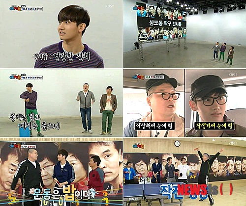 첫회 종목은 탁구였다. 연예인 탁구단 회장인 개그맨 박성호(39)를 비롯해 달인 김병만(38), 그룹 '샤이니'의 민호(22), 탤런트 조달환(32) 등이 출연했다. 시청자들로 이뤄진 '상도동'팀과의 대결을 앞두고 팀내 서열을 정하는 등 아웅다웅하는 모습이 전파를 탔다.