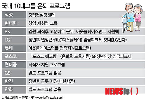 뉴시스가 19일 국내 10대 그룹을 상대로 정년을 앞둔 임직원들을 위한 은퇴 프로그램 운영 실태를 파악한 결과 삼성, 현대차, LG, 포스코, 현대중공업, 롯데 등 6개 그룹에서 노후생활 컨설팅이나 창업 재취업 지원 등과 같은 프로그램을 운영하고 있다.