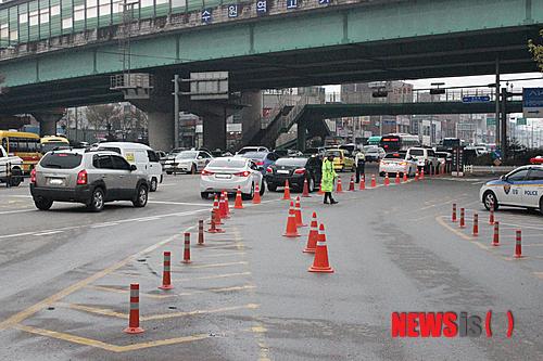 이날 오후 4시56분. 취재진은 애경백화점 측의 불법 라바콘 설치, 차량 통제와 이 때문에 생긴 차량 사고 위험 등을 단속해 달라고 112에 신고했다.