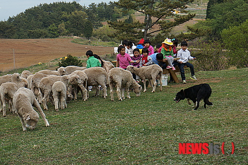 【남해=뉴시스】김정환 기자 = 파란 하늘에 하얀 구름이 떠가고, 바다에는 하얀 물결이 일렁이며, 푸른 초원 위에는 하얀 양떼가 평화롭게 노니는 동화 같은 풍경에서 어린 양을 품에 안아 보고, 식탐 많은 양들에게 먹이를 주고, 덤으로 양몰이까지 배울 수 있는 곳이 있다.