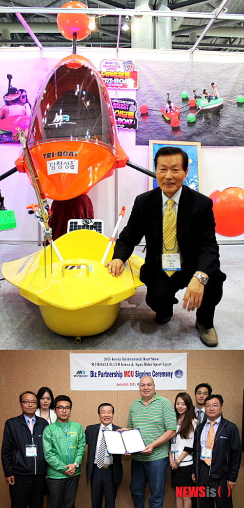 【서울=뉴시스헬스/뉴시스】㈜마이보트와 Aqua Rider Sport Egypt사(President Mr. EI-Deeb)는 지난 2일 '2013 경기국제보트쇼 사무국 VIP룸'에서 Tri-Table Boat의 북아프리카와 유럽지역 판매를 위한 업무협약(MOU)을 체결했다고 3일 밝혔다.