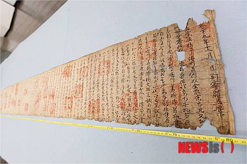 10m에 달하는 두루마리 종이 위에 빽빽하게 담긴 소송 기록은 현재 알려진 노비 소송 문서 중에서도 보기 드문 형태의 희귀 고문서다.