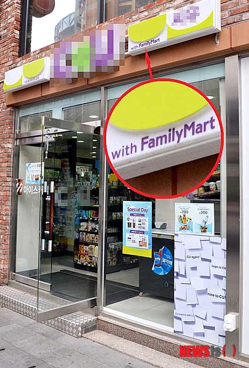 그러나 바뀐 간판에는 작은 글씨로 'with FamilyMart'라는 문구를 병기하고 있어 의문을 낳는다.