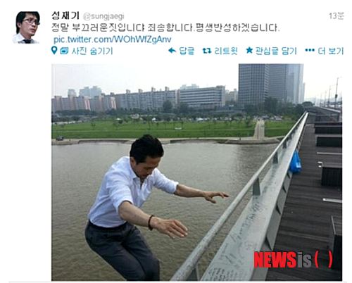 【서울=뉴시스】박성환 기자 = 성재기 남성연대 대표가 한강에 투신하는 모습이 담긴 사진을 자신의 트위터에 올려 우려를 낳고 있다.