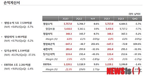2일 KT는 2013년도 2분기 5조 7570억원의 매출을 기록했다고 밝혔다. 그 동안 지속 추진해 온 그룹사 성장과 미디어·콘텐츠 분야 성장에 힘입어 전년동기 대비 0.8% 증가했으나 전분기 대비 –5.7% 감소했다.