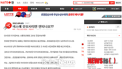 지난 5일 한 육아맘은 온라인커뮤니티 네이트 판에 '버스에 유모차타면 안되나요?'라는 제목의 글을 올렸다. 6살과 3살 아이를 키운다는 글쓴이는 "오늘 오후 장애인이 탑승할 수 있는 계단 없는 버스에 유모차를 들고 탄 무개념 1인이다. 저는 번화가에 사는데 제가 탄 버스는 (제가 사는) 그쯤에서 자리가 많이 빈다. 그걸 감안해 버스가 도착하는 시간부터 유모차를 들어 버스에 탑승했다"고 말문을 열었다.