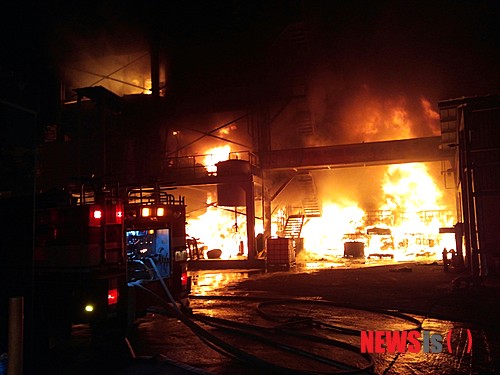 【영천=뉴시스】박준 기자 = 10일 오후 7시5분께 경북 영천시 금호읍 폐유정제공장인 에이스텍에서 화재가 발생했다.