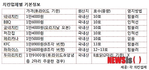18일 업계에 따르면 BBQ, 굽네치킨, 네네치킨 등 배달을 전문으로 하는 치킨집은 대부분 10호닭을 주로 쓰는 것으로 나타났다.
