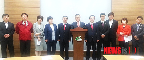 새누리당 충북도당은 30일 오후 충북도청 브리핑실에서 기자회견을 열고 "이 지사는 무리한 공약과 '우왕좌왕 행정'으로 KTX오송역 일대 주민 가슴에 대못을 박은 점을 사죄하라"면서 "이른 시일 안에 주민피해를 최소화하고 지구지정해제에 따른 난개발 문제 등을 해결할 대안을 제시하라"고 요구했다.