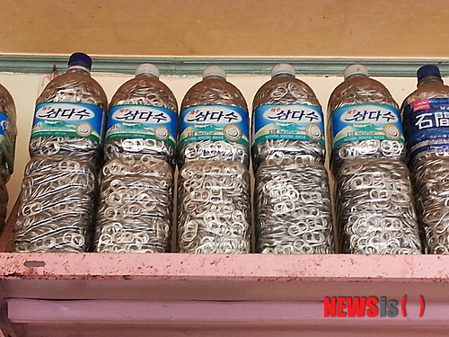 선반위에 가지런히 놓인 1.8ℓ 생수병 14개에는 알루미늄 캔 뚜껑이 병 입구까지 빼곡히 들어차 있었다. 그녀가 현재까지 모은 캔 뚜껑 개수는 대략 3만여 개로 알려졌다.