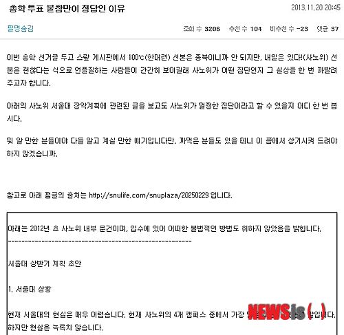 이 재학생은 서울대 내 사노위 회원 현황 등을 분석한 2012년 초 사노위 내부 문건을 인용해 "투표하지 않는 것이 정답"이라고 주장했다. 이 글은 21일 오후 10시30분 기준 조회수 3090여건, 추천 수 100여건을 기록하며 뜨거운 호응을 얻고 있다.
