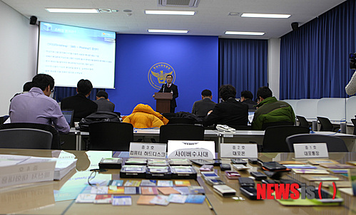 【내포=뉴시스】문승현 기자 = 충남지방경찰청 사이버범죄수사대는 19일 악성코드가 포함된 휴대전화 문자메시지(SMS)를 통해 빼낸 개인정보로 소액결제를 하는 이른바 '스미싱'행각을 벌인 이모(50)씨와 김모(39)씨 2명을 컴퓨터등사용사기 혐의로 구속했다.