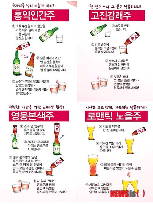 우선, 소주 1잔을 따라내고 빈 공간에 홍초 50㎖를 넣고 섞는 홍익인간주, 소주잔에 홍초가 가라앉도록 살짝 따라 첫 맛은 쓰지만 끝 맛은 달콤한 고진감래주, 홍초50㎖ 병을 소주병 위에 세워 자동으로 섞이게 만드는 영웅본색주, 홍초가 맥주와 섞여 아름다운 붉은 빛을 내는 로맨틱 노을주 등이다.