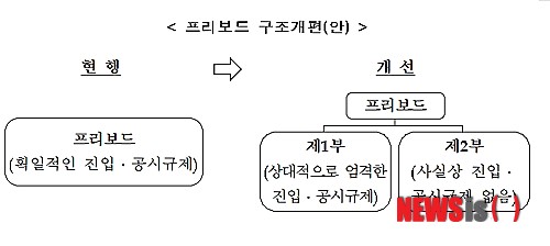 개편방안에 따르면 프리보드시장은 차별화된 진입·공시기준에 따라 복수의 소속부로 운영된다. 제1부의 경우 상대적으로 엄격한 진입·공시 규제를 적용하고 이를 충족하는 비상장법인의 주식이 거래되는 시장이다. 제2부는 주식 유통에 필요한 최소한의 요건을 갖춘 모든 비상장법인의 주식을 거래할 수 있는 시장이다.