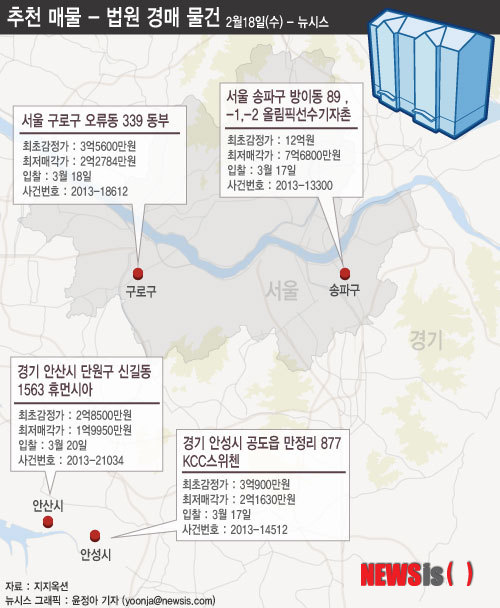 서울 송파구 방이동 올림픽선수기자촌 247동 902호. 1989년 준공된 122개동 5540가구 대단지로 해당 물건은 10층 건물 중 9층이다. 5호선 올림픽공원역에서 도보로 5분 거리이다. 올림픽공원. 서울아산병원 등의 레저편의시설이 있고 오륜초, 세륜초, 오륜중, 보성중, 창덕고, 보성고 등의 교육시설도 가까이 있다. 최초감정가 12억원에서 2회 유찰돼 이번 경매 최저매각가는 7억6800만원이다. 입찰은 다음달 17일 서울동부지법 경매 4계. 사건번호 2013-13300.