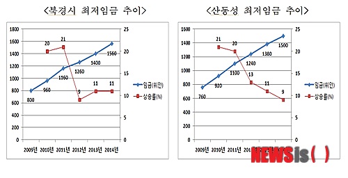 또한 한국기업들이 가장 많이 진출해 있는 산둥성의 최저임금도 5년 전(2009년)에 760위안이었지만 올해 1500위안으로 2배 가량 상승했다.
