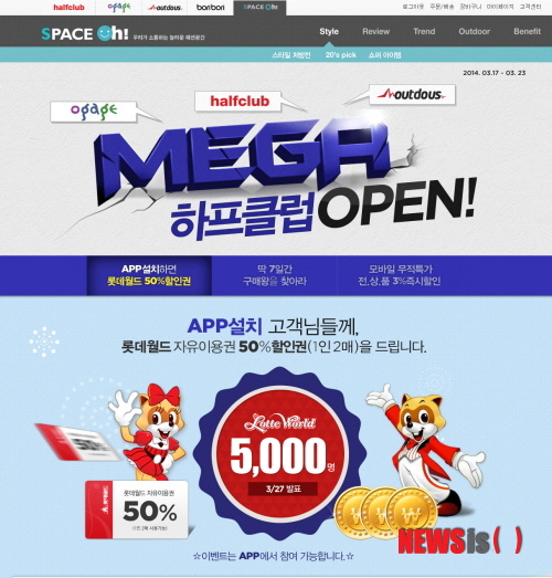 메가몰로 변신한 하프클럽은 △스포츠/아웃도어 △트렌드/Soho △유아동 전문관을 마련, 국내 최대 상품을 구비해 쇼핑의 폭을 넓혔다. 또한 패션에 대한 폭넓은 정보를 만나 볼 수 있는 콘텐츠 커뮤니티 ‘스페이스 오’를 통해 실시간 패션 정보와 전문가가 제안하는 큐레이션 쇼핑 서비스도 제공한다.