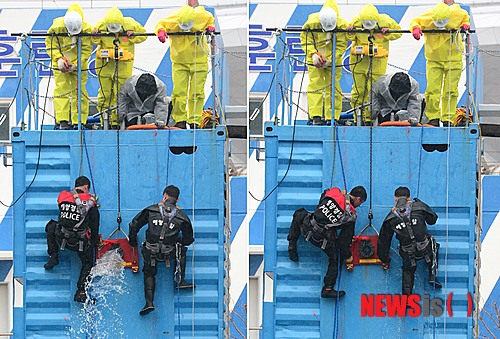부산해경과 해양수산연수원은 이날 오후 부산 영도구 해양수산연수원에서 해양경찰 특수구조단, 정유사, 방제업체 등이 참관하는 가운데 선박 파공 봉쇄 및 유출유 회수시스템 현장 적용 훈련을 실시했다.