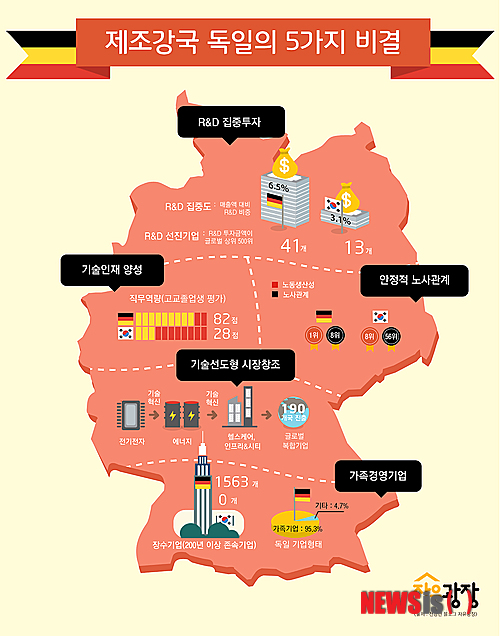 2012년 기준 R&D 투자순위로 본 글로벌 500대 기업 리스트에 독일 기업 41개가 이름을 올린 반면, 한국은 13개에 그쳤다. 매출액 대비 R&D 비중도 또한 독일(6.5%)이 한국(3.1%)의 2배를 넘어섰다.
