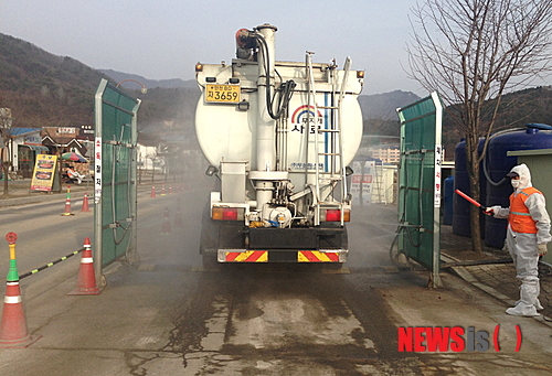 【화천=뉴시스】김영준 기자 = 강원 화천군은 AI 확산 방지를 위해 민·군·관 합동으로 사내면 2개소 도로변에 거점소독시설 및 이동통제 시설을 설치하고 이동 차량 소독에 총력을 기울이고 있다.