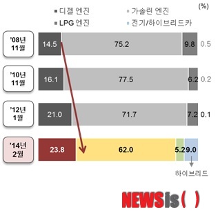 반면 디젤 엔진에 대한 소비자들의 인식은 바뀌고 있다. 디젤 엔진 선호도는 2008년 14.5%에 불과했지만 2010년 16.1%, 2012년 21.0%, 올해 23.8%로 증가를 지속하고 있다.