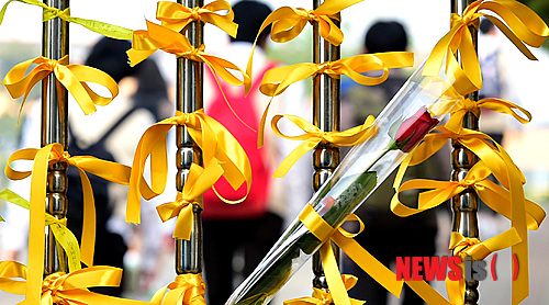 몇몇 학생들의 가슴에는 희생자를 애도하는 '검은 리본'과 실종자들이 기적같이 살아 돌아오기를 기원하는 '노란 리본'이 달려있었다.