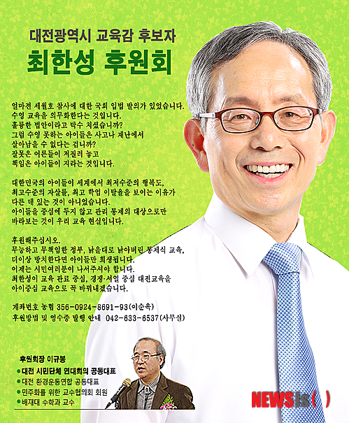 최한성 후보는 "오직 시민의 힘으로 선거를 치르고 있다는 자부심으로 그간 선거운동을 해왔다"며 "정체된 대전 교육의 변화를 바라는 뜻있는 시민들의 참여를 부탁드린다"고 말했다.
