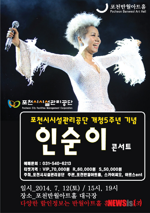 【포천=뉴시스】이종구 기자 = 경기 포천시시설관리공단은 개청5주년을 맞아 특별 콘서트로 ‘인순이 콘서트’를 오는 7월 12일 오후 3시, 7시 두 차례에 걸쳐 포천 반월아트홀 대극장에서 개최한다.