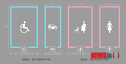 임산부와 여성 우선 주차구역 구획선은 분홍색으로 이미지는 흰색으로 각각 표시하는 통합디자인을 적용했다.