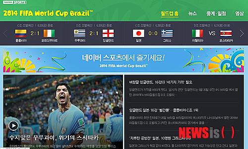 【서울=뉴시스】김민기 기자 = 네이버는 2014 브라질 월드컵을 맞이 해 월드컵 특별페이지를 운영을 통해 실시간으로 경기 영상과 문자 중계, 기사 등 다양한 콘텐츠를 제공한다.