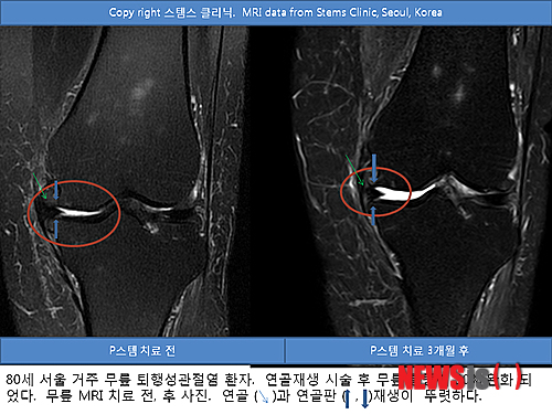 【서울=뉴시스】김태은 기자 = 퇴행성관절염을 앓는 80세 여성의 무릎연골이 재생됐다. 자가 지방줄기세포·혈소판풍부혈장(PRP) 혼합 치료의 효과다. 이 결과는 영국의 학술지 ‘저널 오브 메디컬 케이스 리포트’에 게재됐다.